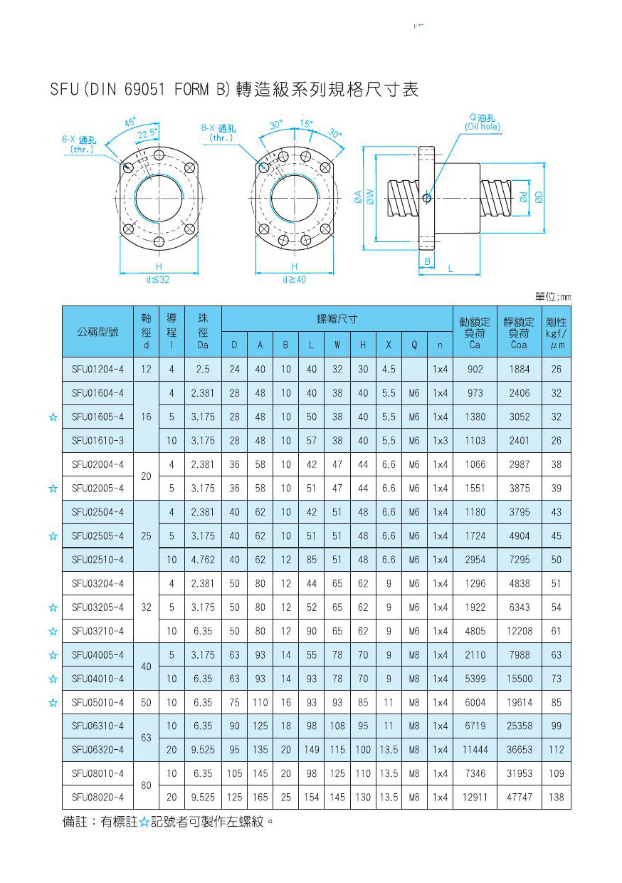除目录中标准规格之外,我公司接受非标定制;可按轧制丝杠尺寸加工高精度研磨滚珠丝杠。